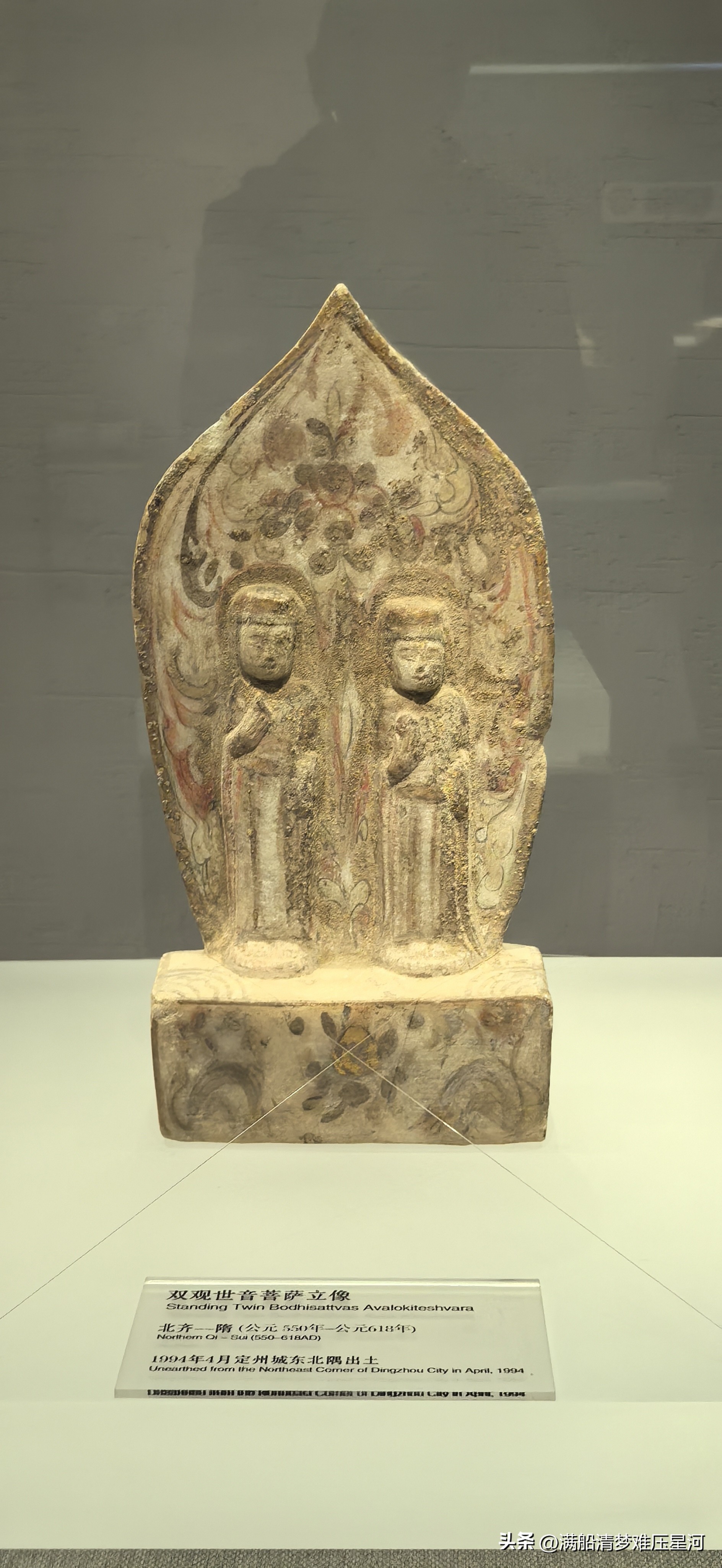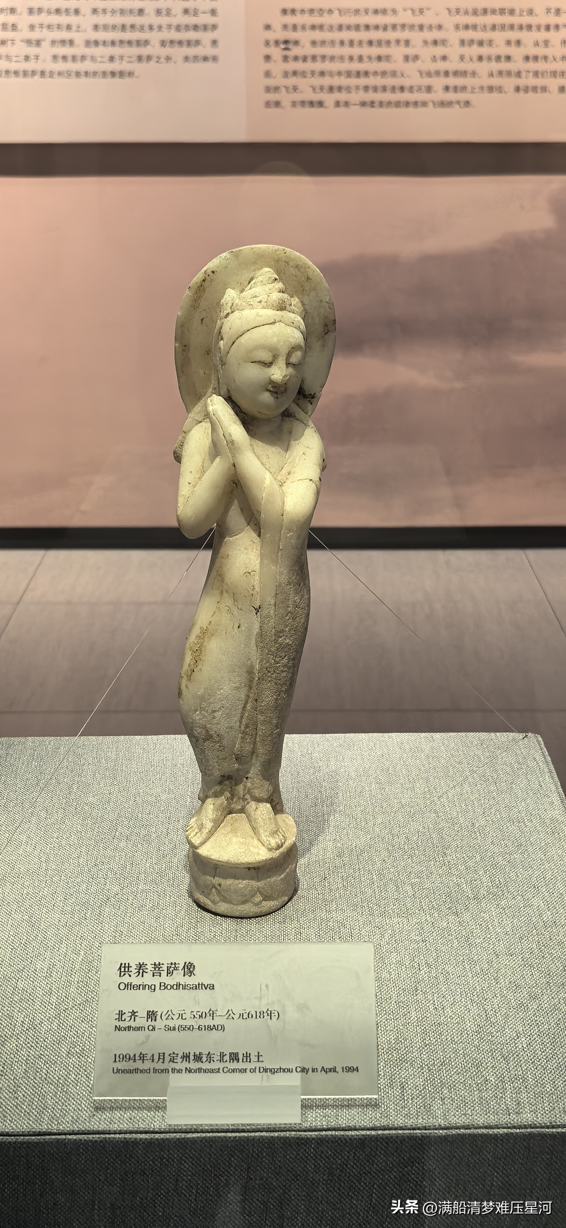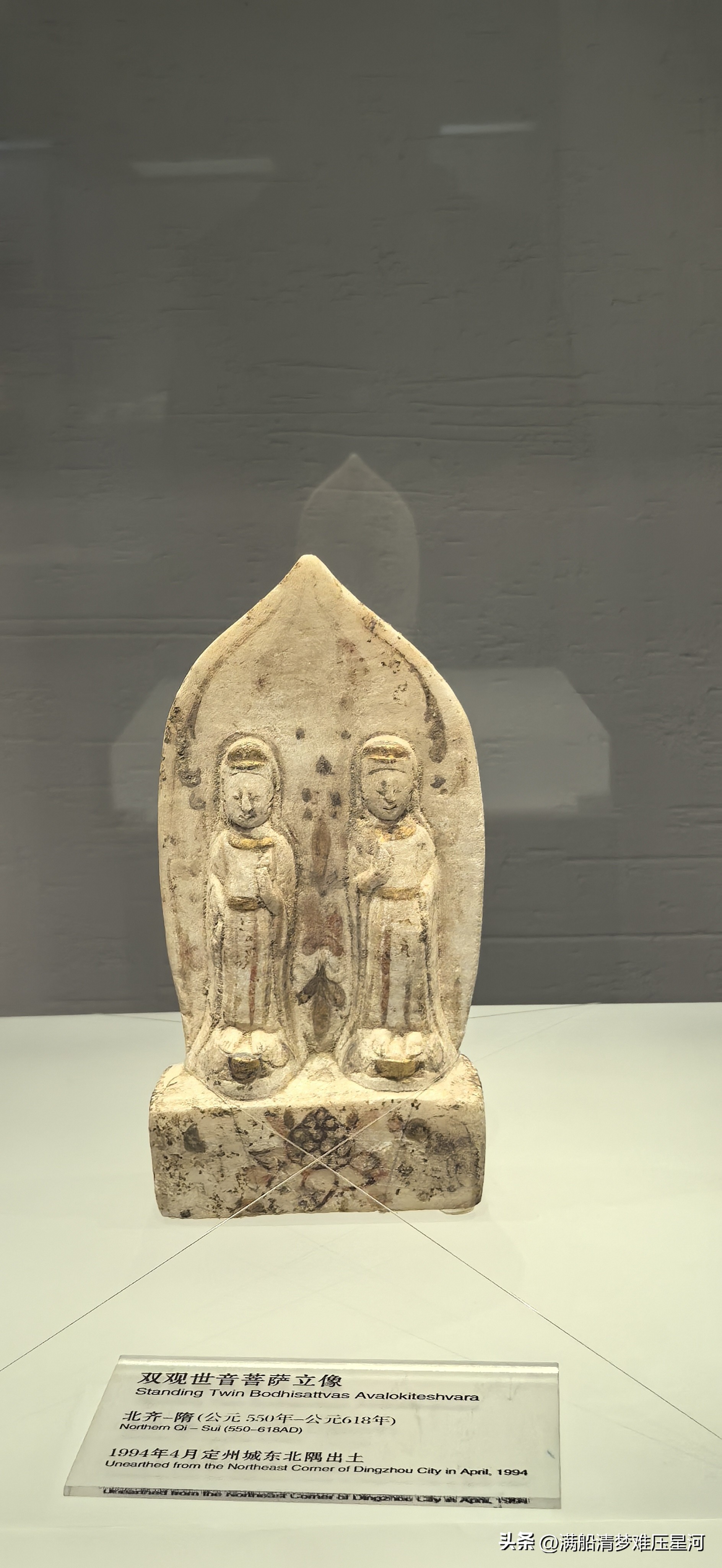 · 白石胁侍菩萨像:被誉为定州博物馆最美的造像之一(制作年代为北齐至隋代)。菩萨发髻呈螺旋状,面容丰颐秀目,神情安详恬静。其双手合十于颈右侧,作祈福状。身着袒右袈裟,贴体垂下,身体呈现出优雅的曲线美,开启了隋唐造像“一波三折”身体造型的先河。
