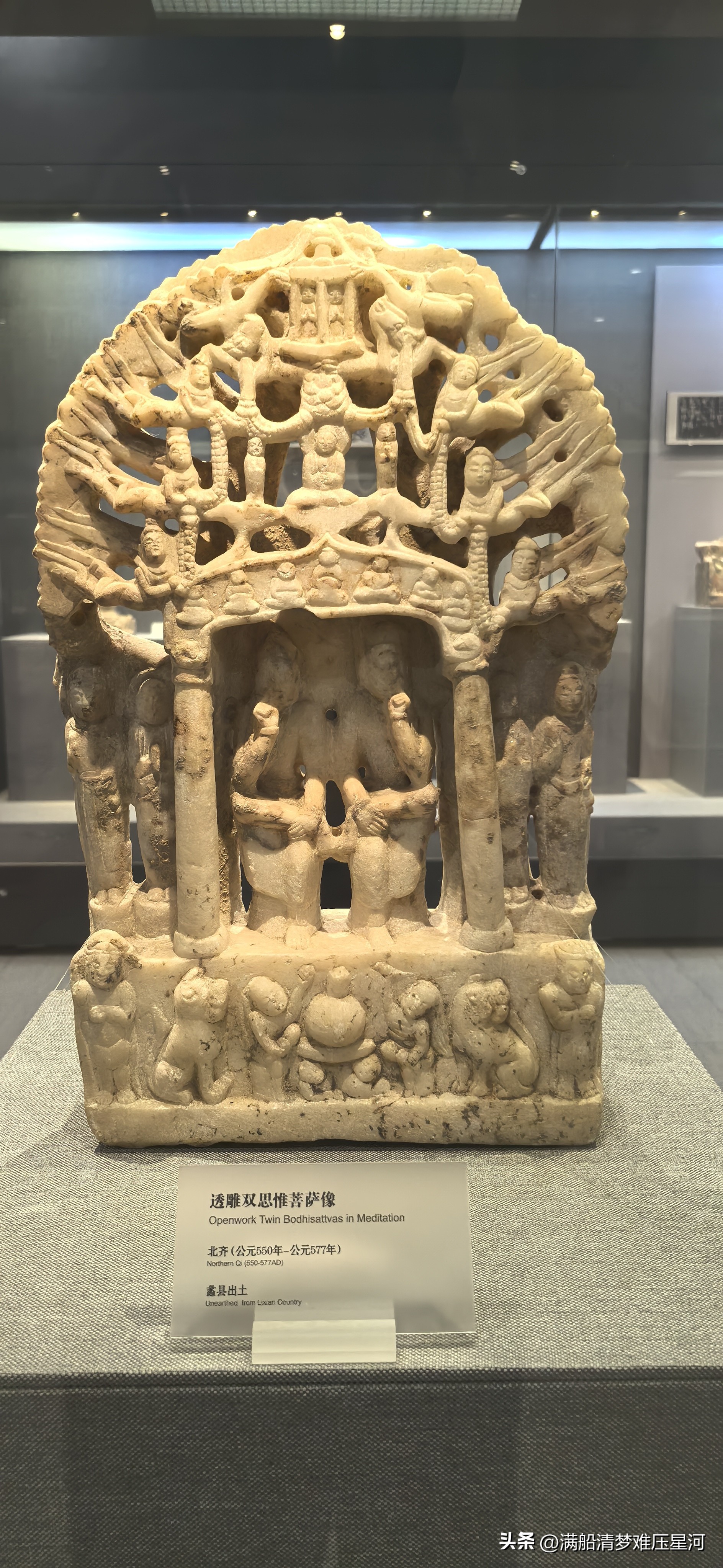 · 北齐 白石透雕双思惟菩萨像:这件造像以其复杂的透雕工艺和丰富的构图著称。它采用透雕龙树背屏,正面主尊为双菩萨呈半跏趺坐于龛中,周围还有双弟子、双胁侍站立龛外。龛和底座还雕有宝塔、坐佛、龙、飞天、力士、护法狮等众多形象,构思巧妙,是河北地区北齐石造像的流行式样。